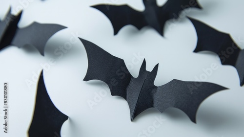 Fototapeta premium Several black bat decorations are arranged on a white background.
