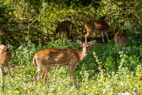 © Kanaga Subramaniyam, Fototapeta premium Several Chital (Spotted or Axis Deer) roam a lush forest or grassland. One deer in the foreground looks toward the viewer, while others graze or move through the green undergrowth in the background.