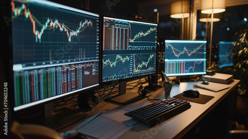 Fototapeta premium several computer screens showing investment charts