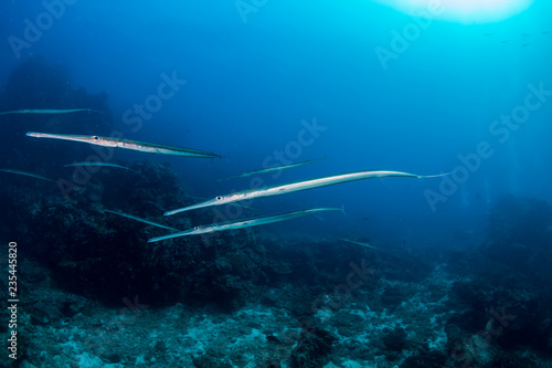 Fototapeta premium Several Cornet Fish hovering on a tropical coral reef