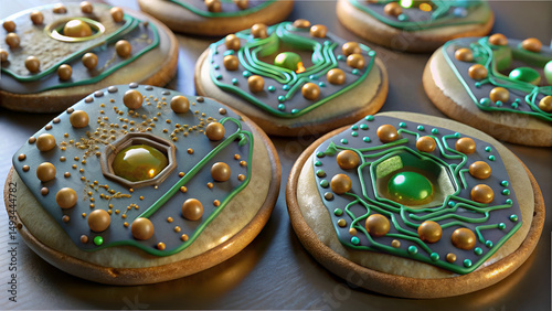 © TheAmazon, Fototapeta premium Several decorated cookies with circuit board and cell designs are displayed