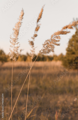 © Юлия Черкасова, Fototapeta premium Several dried flowers of pampas grass on a steppe plot close-up, natural background in a minimalist style