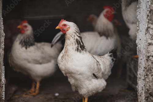 © Олег 21, Fototapeta premium Several farm chickens standing together inside a rustic coop. Natural environment, agriculture scene and authentic poultry farming conditions. Perfect for themes of farming, livestock and rural lifest