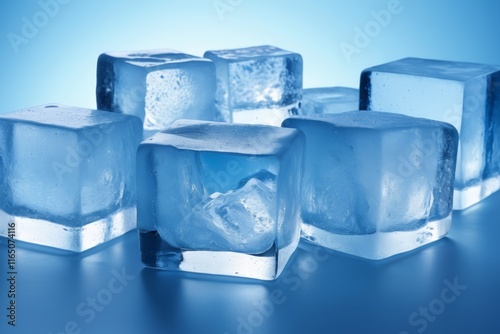 © haiqiang, Obraz premium several ice cubes are lined up on a blue surface