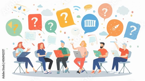 Fototapeta premium Several individuals are sitting around a table, each with a question bubble...