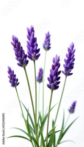 Fototapeta premium Several lavender sprigs, showcasing buds and blossoms, against a stark white...