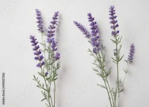 Fototapeta premium Several lavender sprigs with delicate blooms, pure white backdrop , summer,...