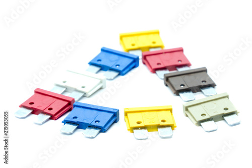 © UrbanWitness, Fototapeta premium Several multi-colored car fuses for the fuse box are laid out in a triangle. Replacing the electric fuses in the car. Isolate on white background. The second plan of the photo is blurred.