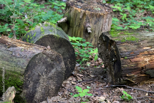 © k49red, Fototapeta premium Several Old Decaying Logs Covered With Green Moss, Lying On The Ground In A Summer Forest. Natural Wood Decomposition.