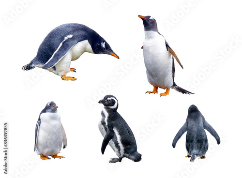 © Raphael, Obraz premium Several penguin Magellanus (Spheniscus magellanicus) in several poses, Ushuaia Penguin on a transparent background
