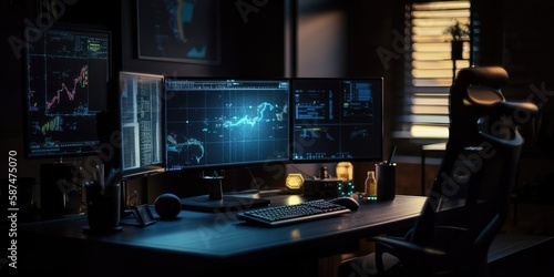 © AKA-RA, Fototapeta premium Several personal computer monitors showing a language coding program with a system monitoring interface. AI generated