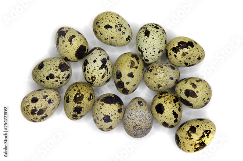 Fototapeta premium Several quail eggs isolated on white, with shadows