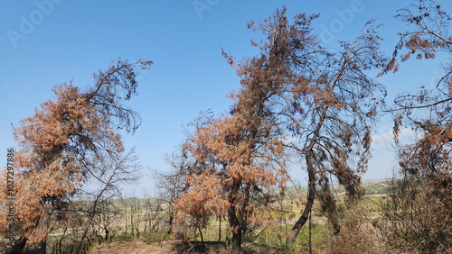 © cilicia, Obraz premium Several red pine (Pinus bruita) trees after a forest fire in a extreme hot and dry summer