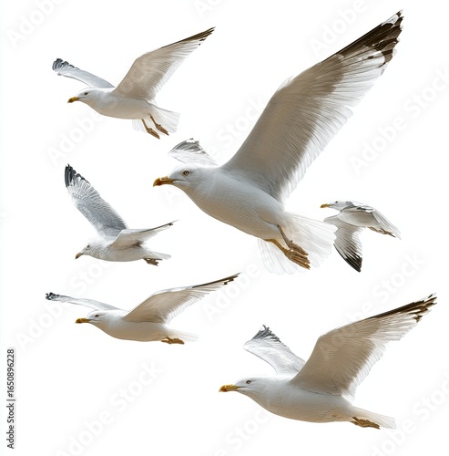 © Durian, Fototapeta premium Several seagulls in flight against a white background