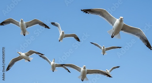 Obraz premium Several seagulls soaring in a clear blue sky, captured in flight