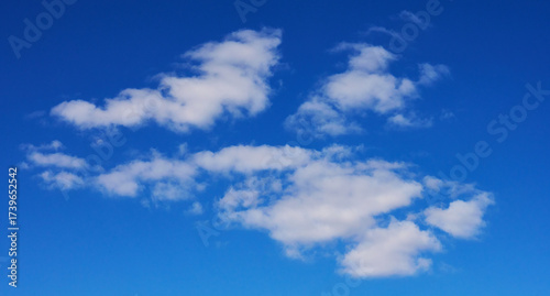 Fototapeta premium Several small cumulus clouds with soft white edges hovering against a clear, rich blue sky