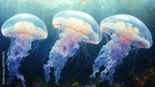© Tabinda, Fototapeta premium Several translucent and tan jellyfish are clustered underwater.