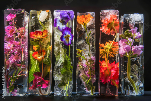 Fototapeta premium Several Translucent Ice Blocks with Colorful Flowers Inside