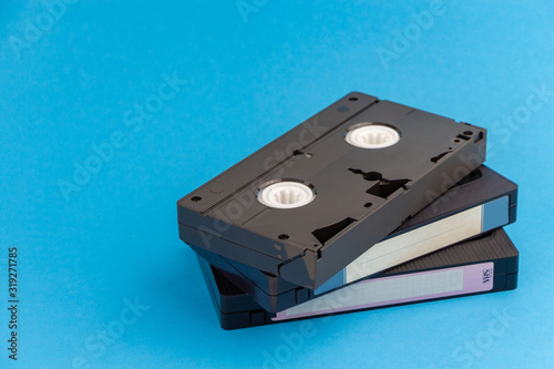 Fototapeta premium Several VHS video cassettes, on a blue background.