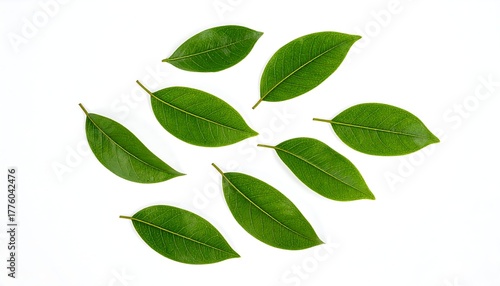© Vena, Naklejka premium Several vibrant, green oval leaves are scattered against a crisp white background, showing textures and details