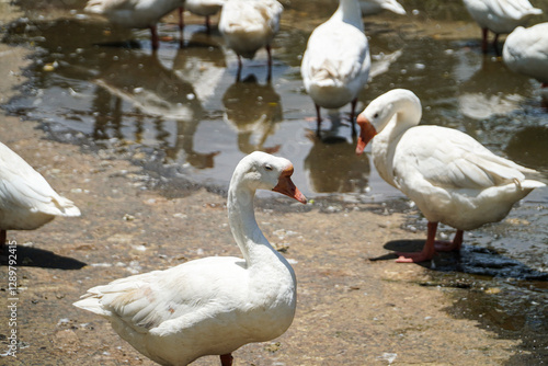 Fototapeta premium Several white geese gather near a muddy puddle. Sunlight reflects off their feathers. A flock of white geese near a muddy puddle on a sunny day