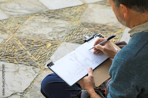 Fototapeta premium sevilla artista dibujante pintando la ciudad en un cuaderno de viaje 4M0A5372-as24