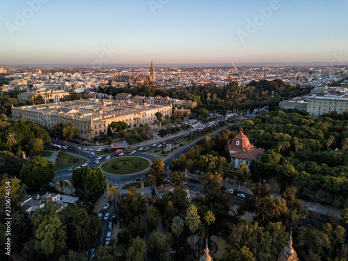 Fototapeta premium Seville. Aerial drone Seville (Sevilla), Spain. University of Seville and the famous Gothic Cathedral of Seville are pictured