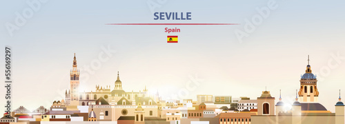 Naklejka premium Seville cityscape on sunrise sky background with bright sunshine. Vector...