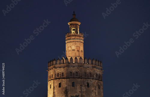 Fototapeta premium Seville, spain - november 10, 2018: Illuminated golden tower of Seville