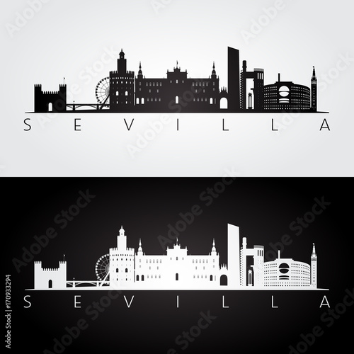 © greens87, Fototapeta premium Sewilla panoramę i zabytki sylwetka, czarno-biały design, ilustracji wektorowych.