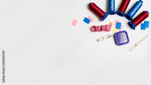 © Mariia, Obraz premium Sewing accessories: spools of thread, pins,chalks,tape and other sewing tools on a white background with copy space. Top view. Flat lay