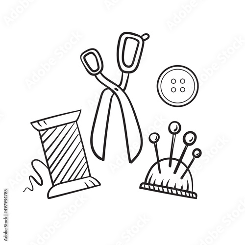 © Tatilya, Fototapeta premium Sewing kit in doodle style. Line vector illustration.