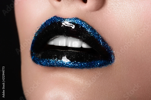 © evgeniyasht19, Naklejka premium Sexual full female lips open. Blue color of lipstick on lips. Creative New Year's make-up. Fashionable image. Brilliants