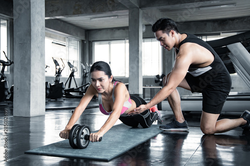 © P Stock, Obraz premium Sexy asian woman workout by ab wheel.