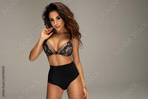 Obraz premium Sexy attractive brunette woman posing in fashionable lingerie in studio