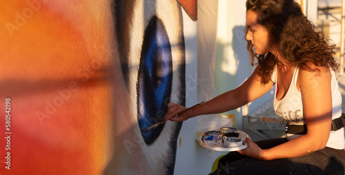 Obraz premium sexy female artist painter woman with curly brunette hair paints a street art...