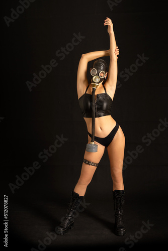 © evgenzz, Obraz premium Sexy girl fetish model with a slim figure poses standing in a black gas mask, black leather or latex sexy underwear and leather. BDSM, perversion, fetish, radioactive or bio-contamination