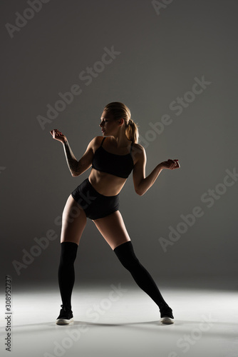 Fototapeta premium sexy girl in black outfit twerking in shadow on grey background