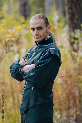 Obraz premium Sexy guy in the woods. In beautiful, old clothes of green color. A medieval...