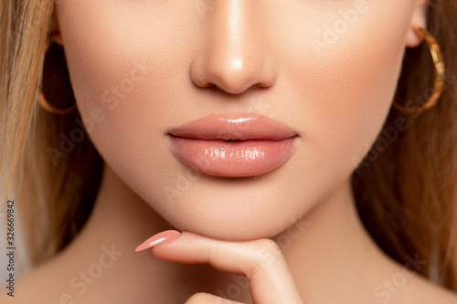 Fototapeta premium Sexy Lips. Make up. Close up Beautiful photo Lips. Manicure. Beauty Fashion Woman Lips with natural Makeup. shine Lipstick. Isolated. Macro Mouth Caramel Colors lacquered model touches her lips
