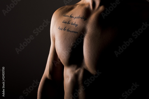 © Victority, Naklejka premium Sexy Muscular Man Tattooed Torso on Black Background. Male Chest Close Up.