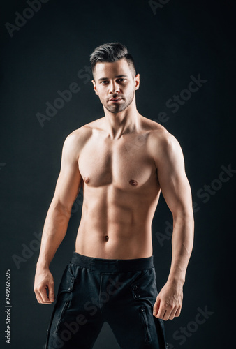 Fototapeta premium Sexy muscular shirtless man posing on black background