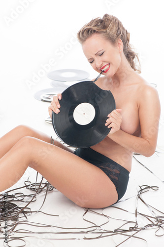 Fototapeta premium Sexy naked girl covered up with vinyl disc