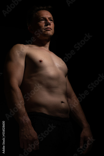 Fototapeta premium Sexy portrait of muscular handsome topless male isolated against a black background