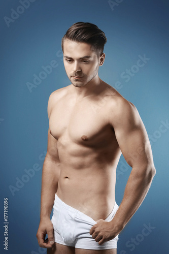 Fototapeta premium Sexy shirtless man in underwear on color background