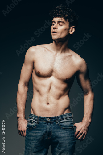 Fototapeta premium sexy shirtless muscular man in jeans posing isolated on dark grey