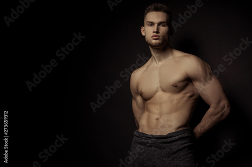 Fototapeta premium Sexy stripped sport muscle guy with grey towel on vlack isolated font background