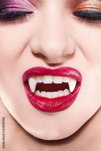 © Ulia Koltyrina, Obraz premium Sexy vampire. Women's lips with red lipstick.