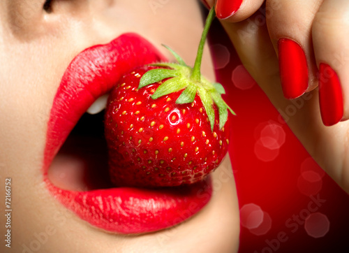 Obraz premium Sexy Woman Eating Strawberry. Sensual Red Lips