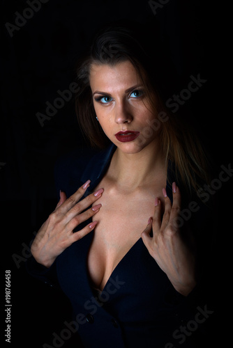 © Sergey, Fototapeta premium Sexy young blonde with red lips on a black background